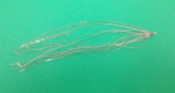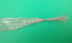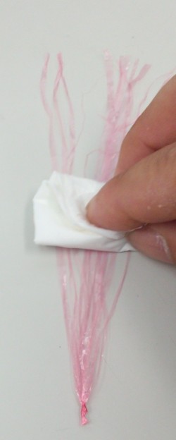 7.くらげ本体を机や床などに置き、結び目を指で押さえながら、ティッシュペーパーで何度もこすります。
